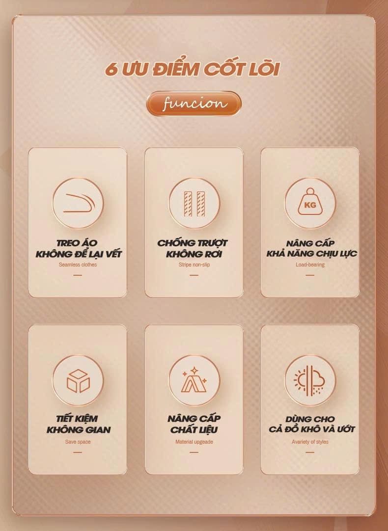- Tiết kiệm không gian: thân móc mỏng, treo sát nhau vẫn dễ lấy.